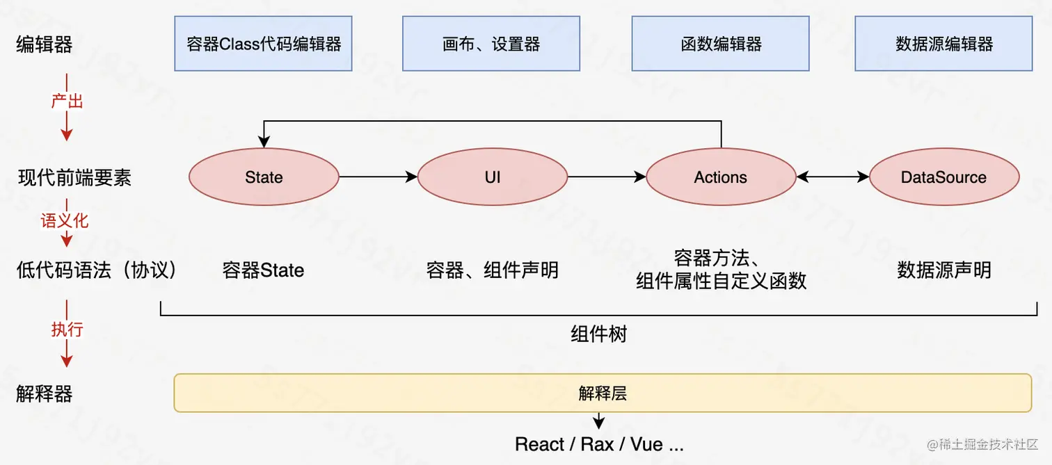 阿里低代码引擎的核心是协议,这份协议是经过打磨的,它是现代前端编程思想的一个语义化表达,现代前端编程思想的核心是组件,因此协议的主体内容是组件树;有状态的容器组件内部有 State 到 UI 视图再通过 Actions 更新 State 这样一个 MVVM 的循环,其中 UI 部分是视图层面的组件,可以通过可视化的画布和属性设置器进行编辑,这是可视化搭建的核心。除此之外,Actions 可以以代码片段的形式来编辑和存储,数据源可以拆解为域名、路径、请求头、参数、前置后置函数来编辑和存储。通过编辑器编辑产出具备现代前端开发要素的协议,基于解释器通过React/Vue等进行执行。这部分就是阿里低代码引擎的核心原理。