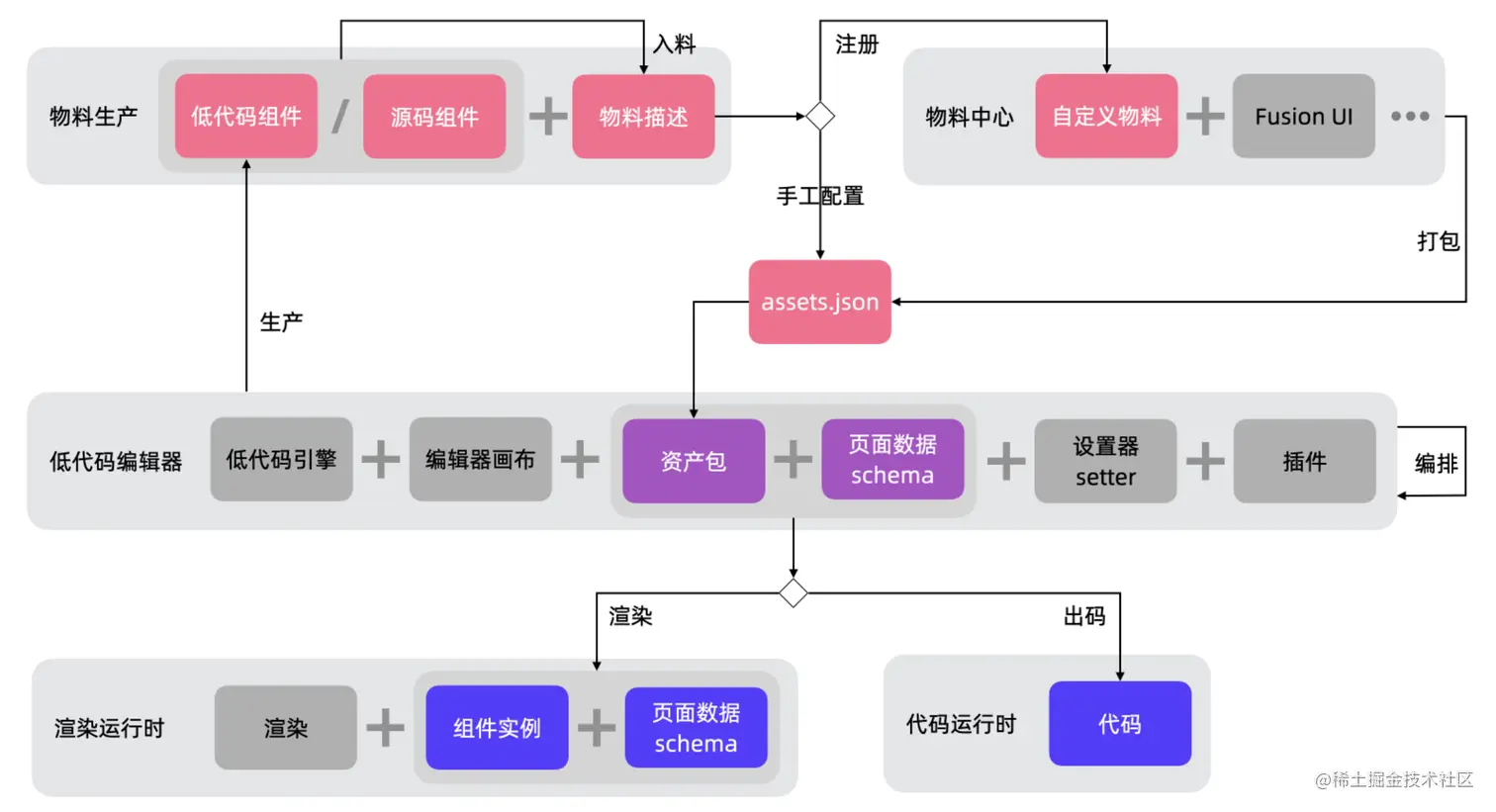 低代码平台的基础设施是物料平台,物料平台需要能够与低代码平台进行适配,为运行时提供物料代码,为编辑态提供物料属性描述以便生成设置表单,这个过程需要两个协议,资产包协议和物料描述协议,下图中心的 assets.json 就是符合这两个协议的一个物料资产数据,下图体现了物料资产在整个低代码研发过程中的核心位置。