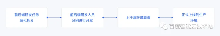 在需求已明确的前提下,“纯手工” 开发上线这样一个流程功能包含「前后端研发任务细化拆分 - 前后端研发人员分别进行开发 - 上沙盒环境联调 - 正式上线到生产环境」等四个步骤。