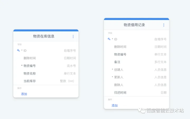 一个完整的流程必然需要相应的数据表来进行流程流转相关信息的承载,而爱速搭提供了一个可视化的建模界面,对于本文开头描述的流程,我们需要建立如图 4 所示的两张数据表,其中 “物资借用记录” 表用于记录用户发起的物资借用请求,“物资在库信息表” 用于记录当前在库的物资名称、库存数量等信息。