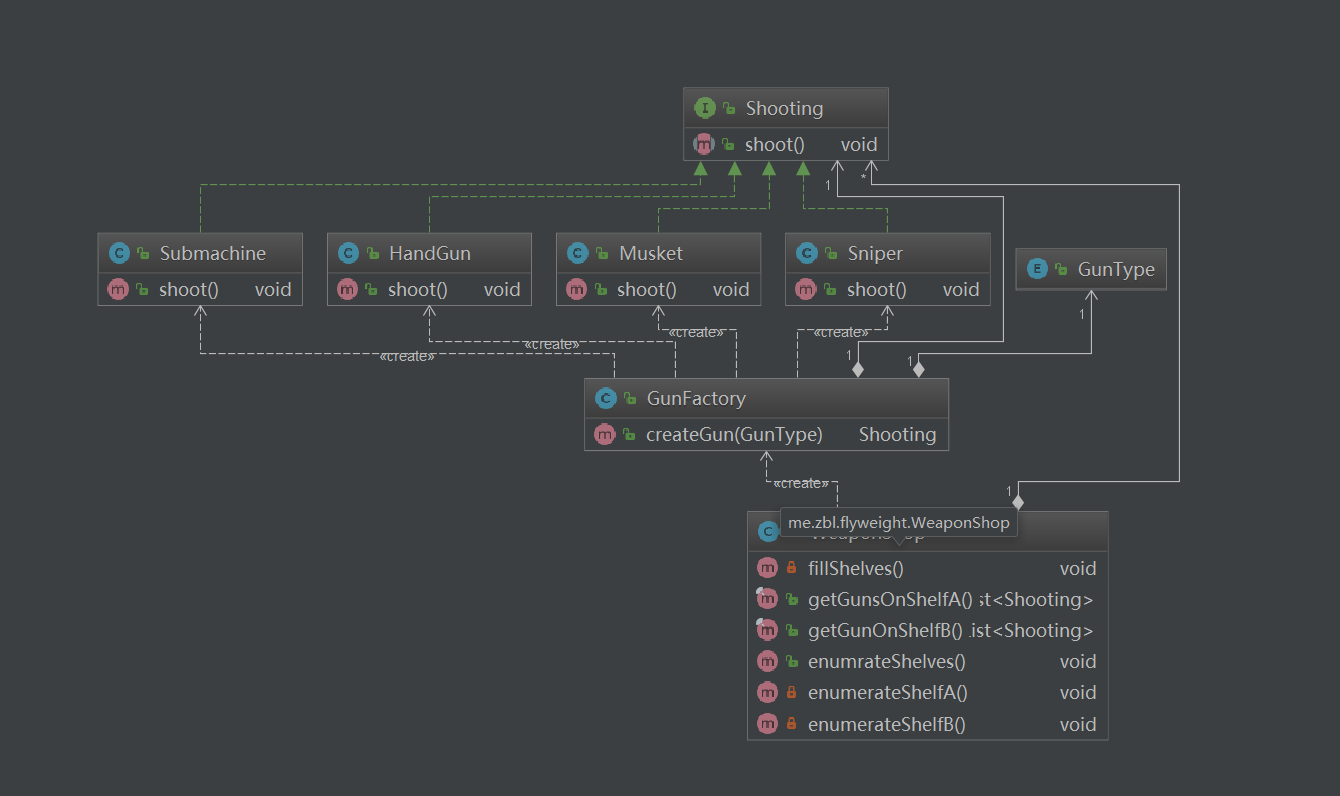 - FlyweightFactory — 创建并管理 flyweight 对象。确保合理地共享 flyweight。当用户请求一个 flyweight 时,FlyweightFactory 对象提供一个已创建的实例或者创建一个(如果不存在的话)。