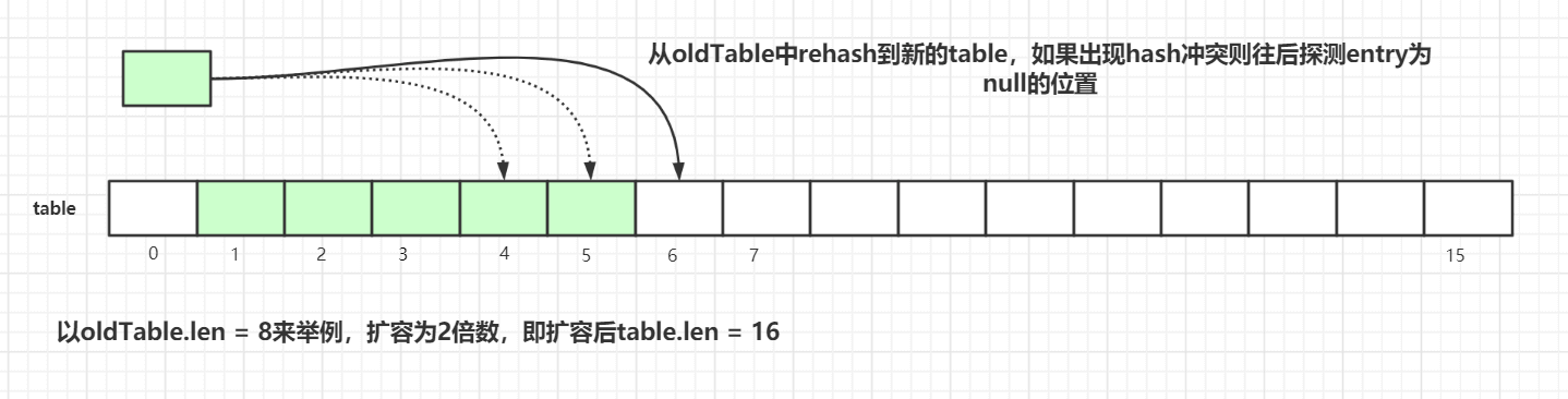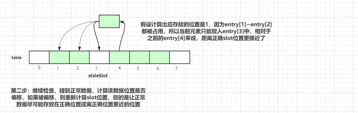 探测式清理是以当前Entry 往后清理,遇到值为null则结束清理,属于线性探测清理。