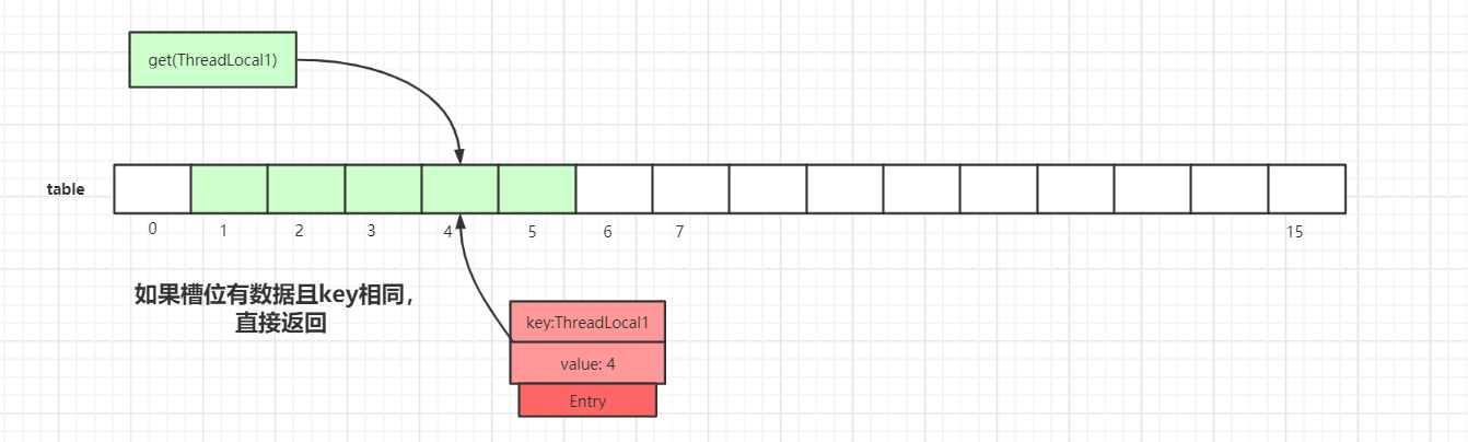 第一种情况: 通过查找key值计算出散列表中slot位置,然后该slot位置中的Entry.key和查找的key一致,则直接返回: