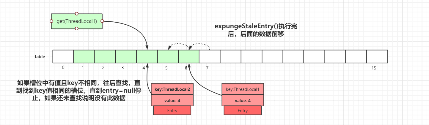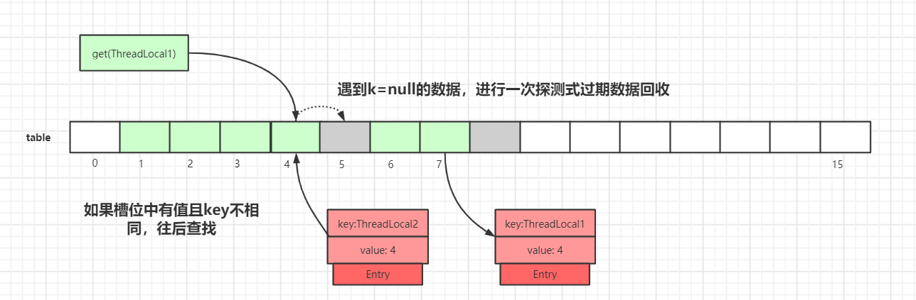 我们以get(ThreadLocal1)为例,通过hash计算后,正确的slot位置应该是 4,而index=4的槽位已经有了数据,且key值不等于ThreadLocal1,所以需要继续往后迭代查找。