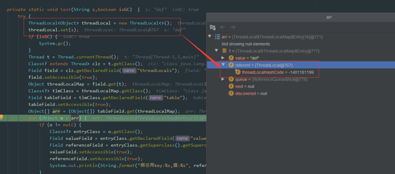 弱引用key:null,值:def如图所示,因为这里创建的ThreadLocal并没有指向任何值,也就是没有任何引用: