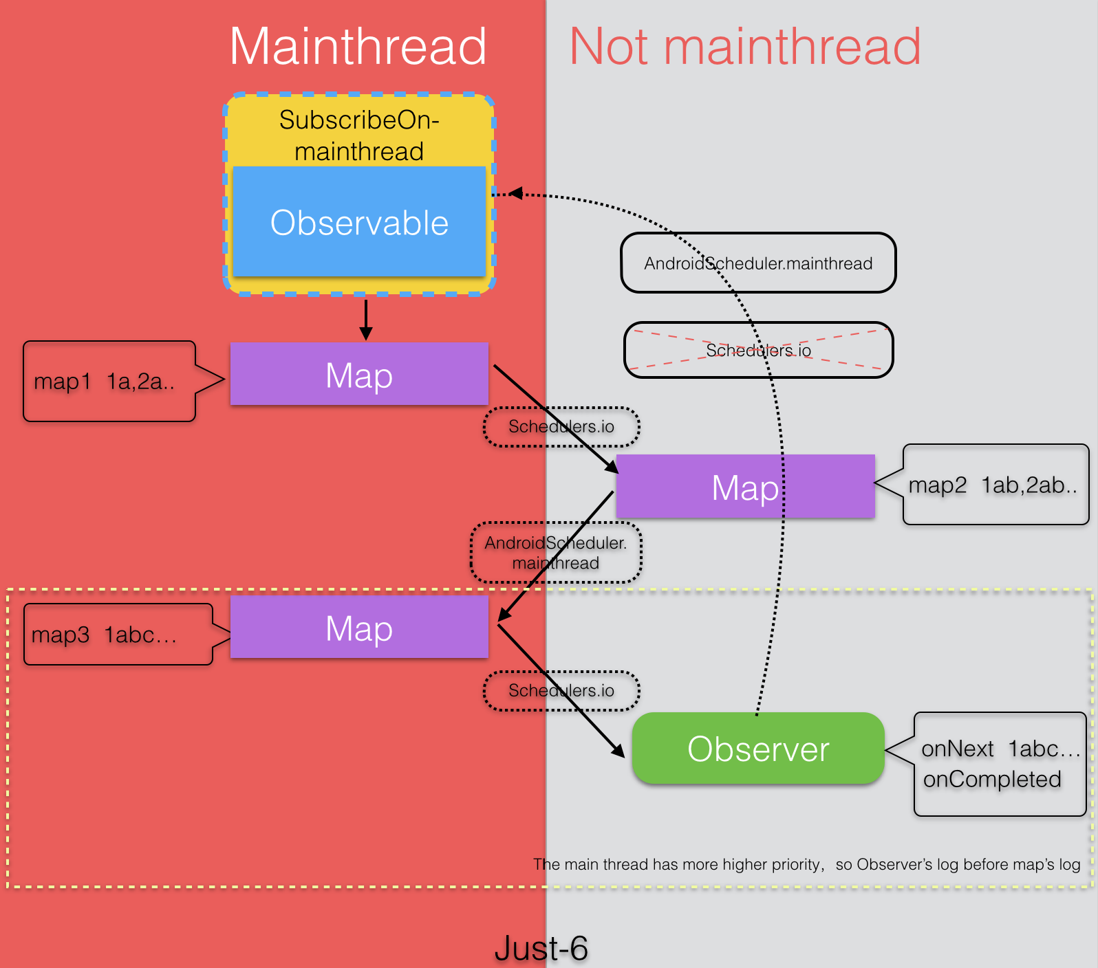 7.这个例子不同的是使用了两次subscribeOn()来指定被观察者的线程,最终最上面的subscribeOn()起作用,下面的subscribeOn()不起作用。然后使用Map对数据转换,这里只是在每个数据后面加‘a’,使用Schedulers.io()切换线程,然后使用Map变换,每个数据后加‘b’,再用AndroidSchedulers.mainThread()切换主线程,用Map对数据加‘c’,最后再切换到非主线程,输出结果。