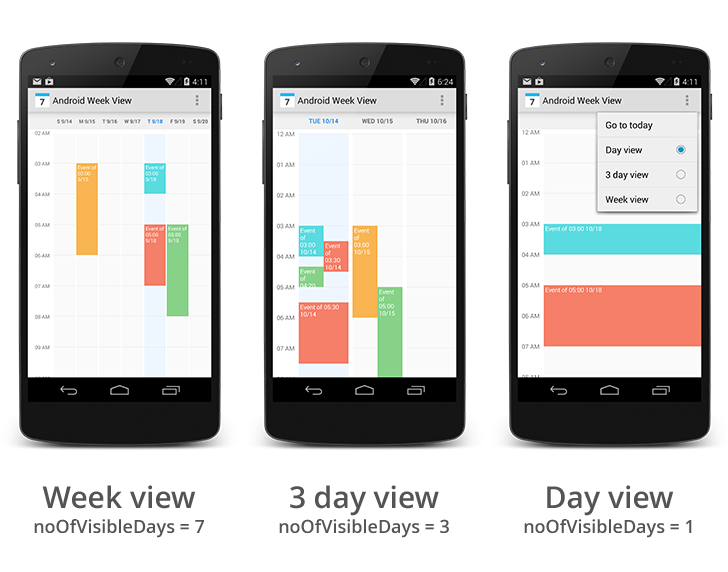 Android Week View is an android library to display calendars (week view or day view) within the app. It supports custom styling.