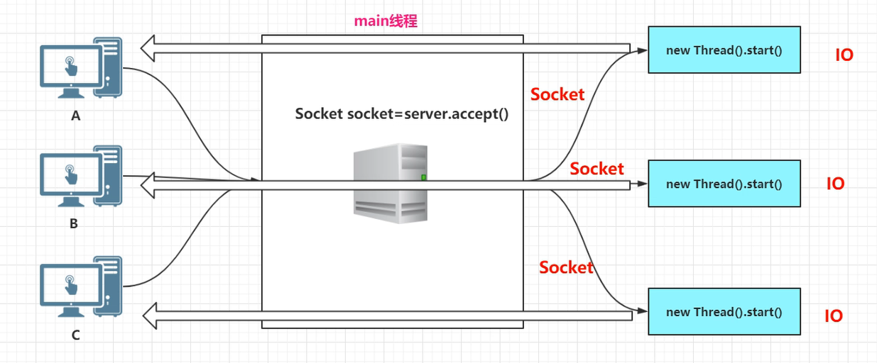 - 服务器绑定端口:server = new ServerSocket(PORT)