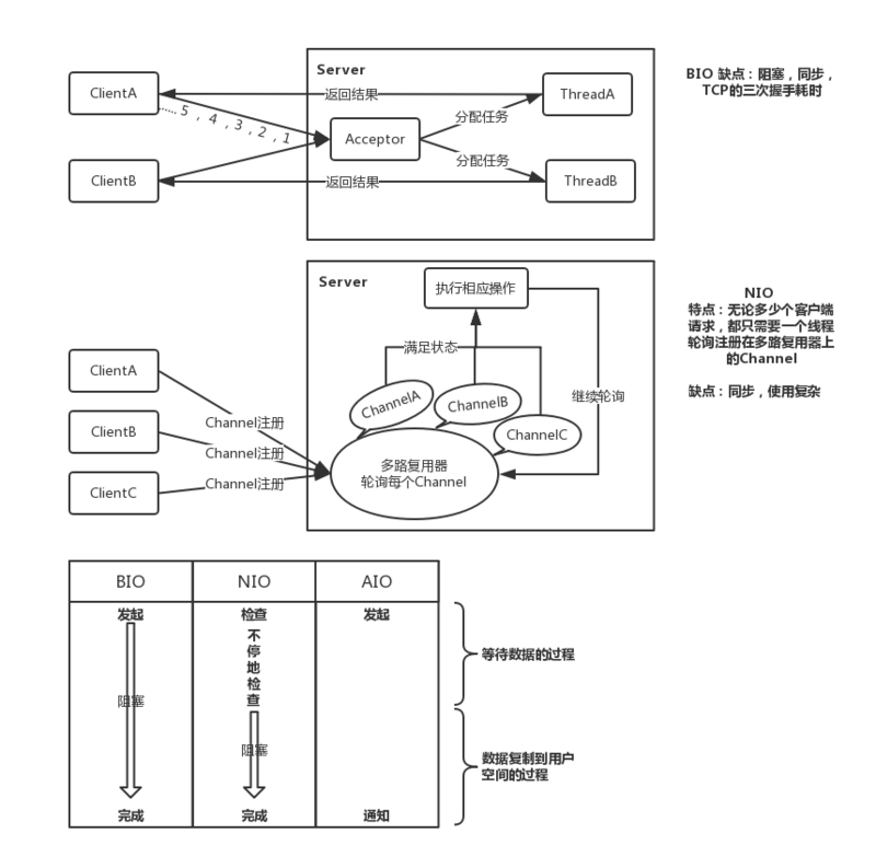 - NIO(同步非阻塞):客户端与服务器通过Channel连接,采用多路复用器轮询注册的Channel。提高吞吐量和可靠性。