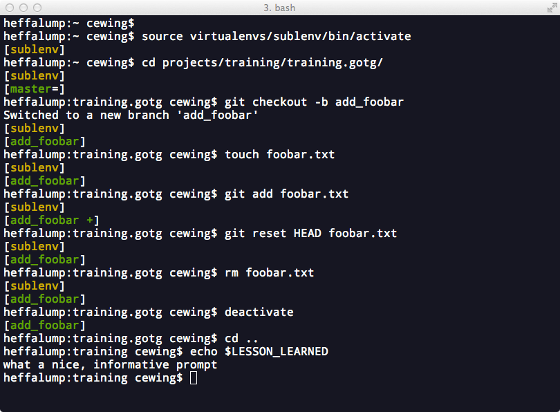 The problem with this is that it doesn’t play well with another incredibly useful tool, virtualenv. When you activate a virtualenv, it prepends the name of the environment you are working on to the shell prompt.