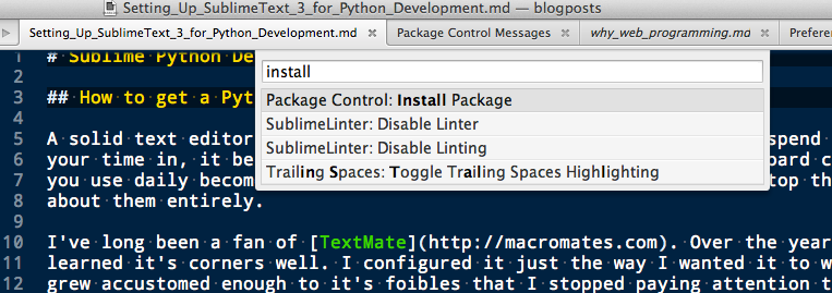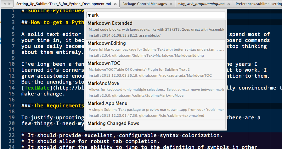 After you select the command, Sublime Text fetches an updated list of packages from the network. It might take a second or two for the list to appear. When it does, start to type the name of the package you want. Sublime Text filters the list and shows you what you want to see. To install a plugin, select it with the mouse, or use arrow keys to navigate the list and hit enter when your plugin is highlighted.
